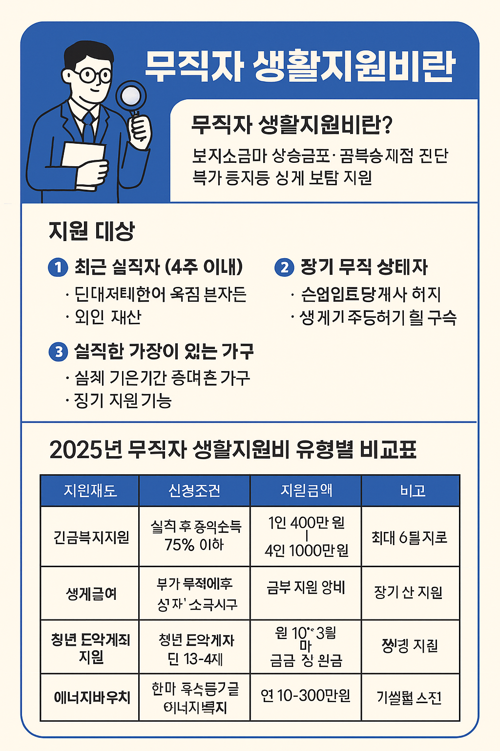 2025년 무직자 생활지원비 유형별 비교표